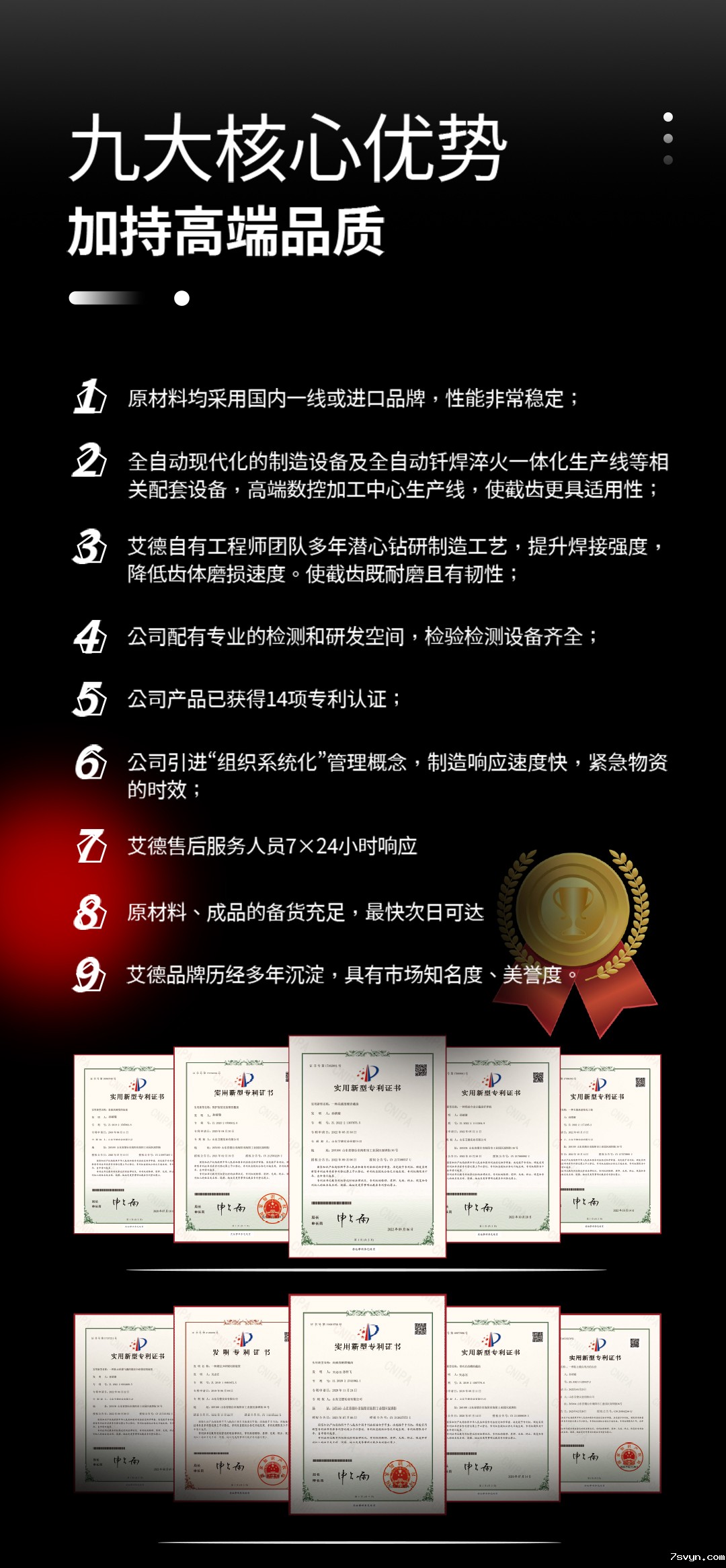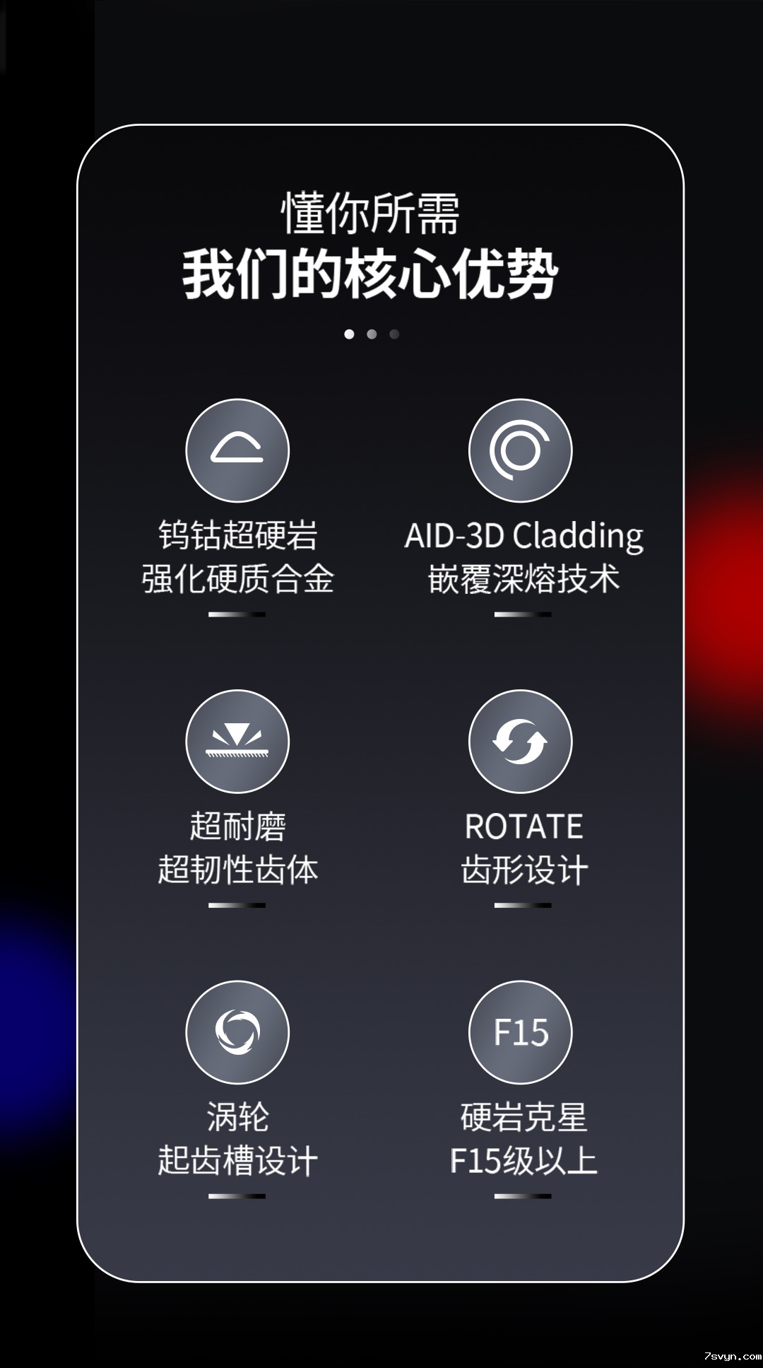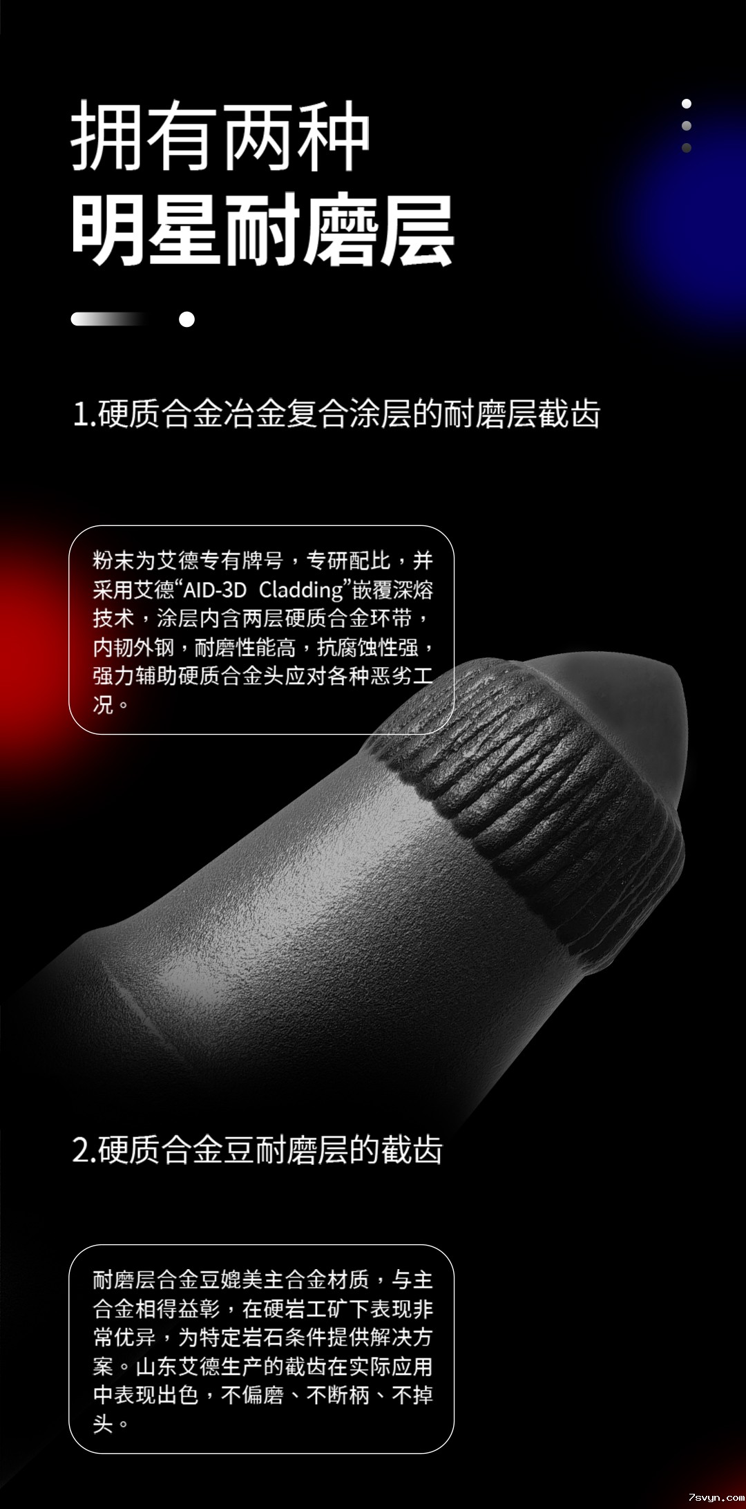 产品材质:钨钴硬质合金(合金头); 碳化钨,硬质合金冶金复合材料(耐磨层); 42Crmo合金钢(齿体)